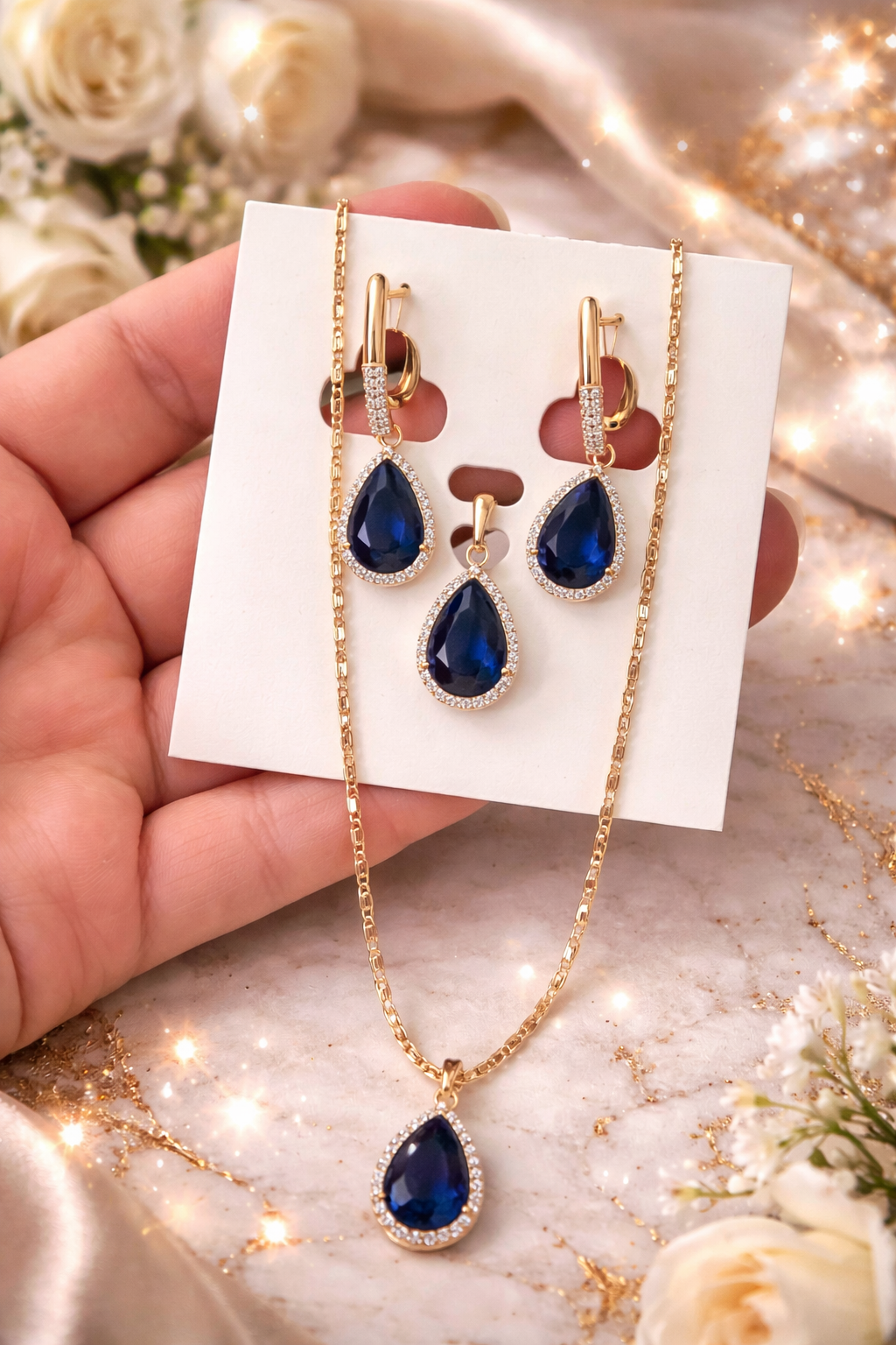 Set dorado con piedras azul profundo en forma de lágrima y detalles brillantes, perfecto para lucir elegante en cualquier ocasión.