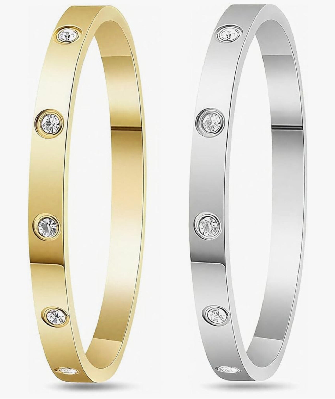 Está disponible en dos acabados: dorado y plateado, ambos con un brillo pulido que le da un aspecto sofisticado. Su forma es rígida tipo aro, lo que aporta estructura y estilo limpio.