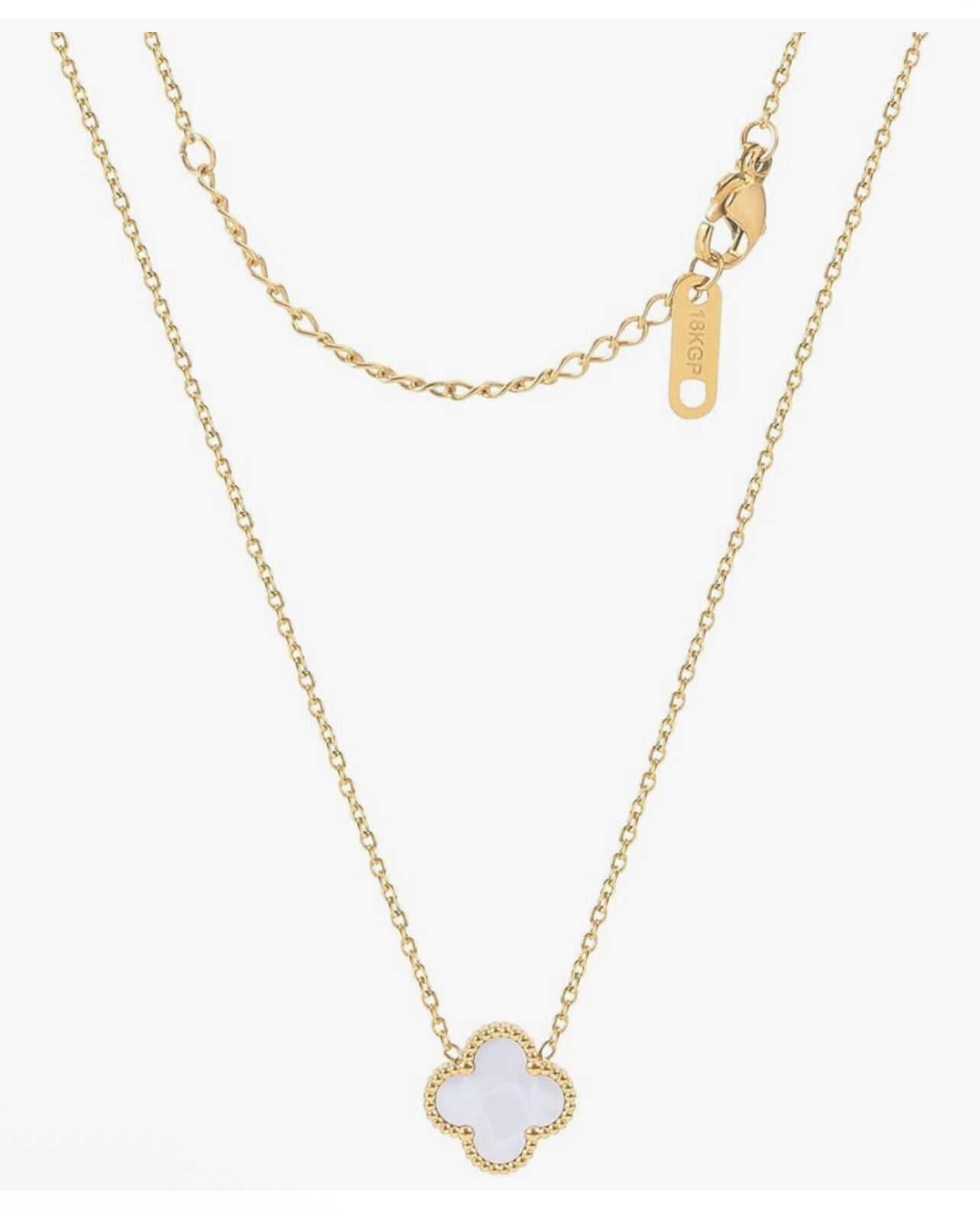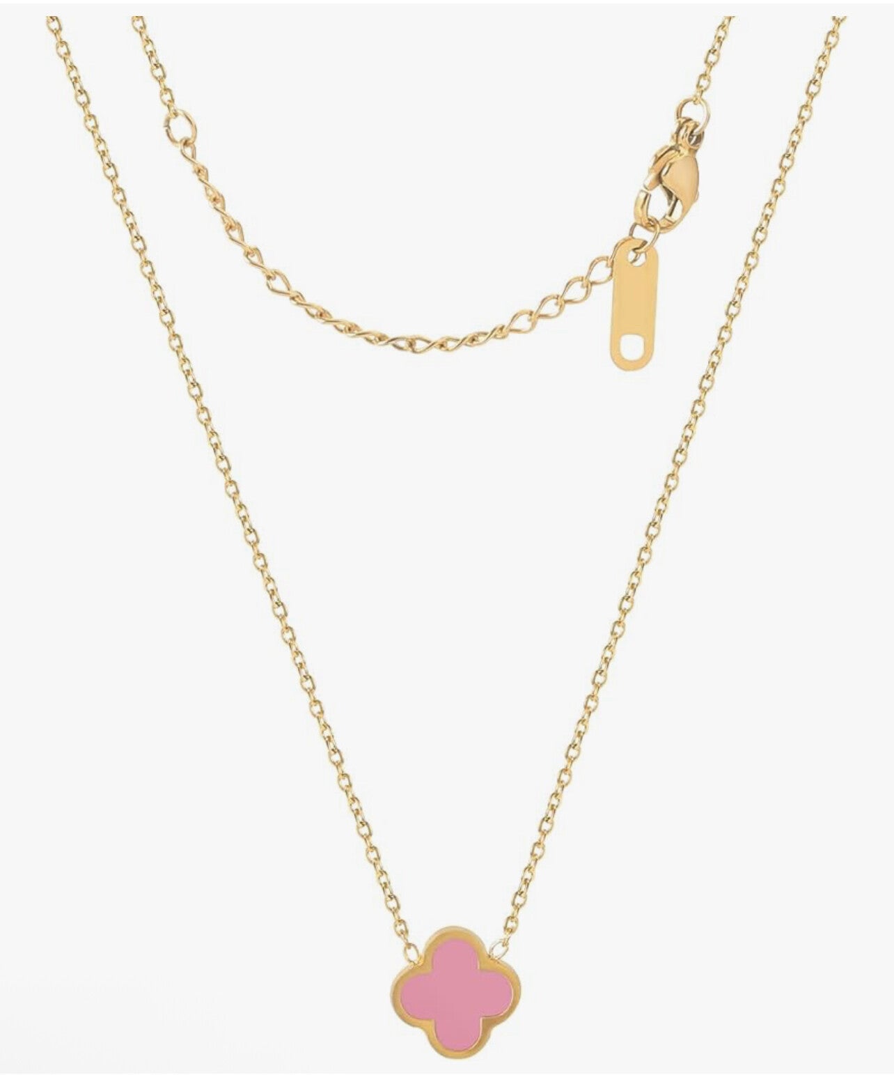 Cadena dorada fina con dije de trébol rosa, delicada y elegante.
