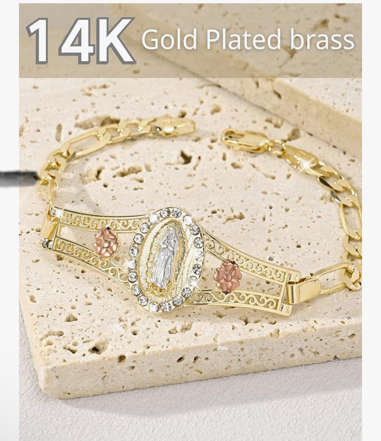 Pulsera de la Virgen María para Mujeres Católica Moderna Circonita Cúbica Cristiana Delicada Charm Diamantes de Imitación Joyería de Oro Mujer Virgen de Guadalupe Pulseras Regalos